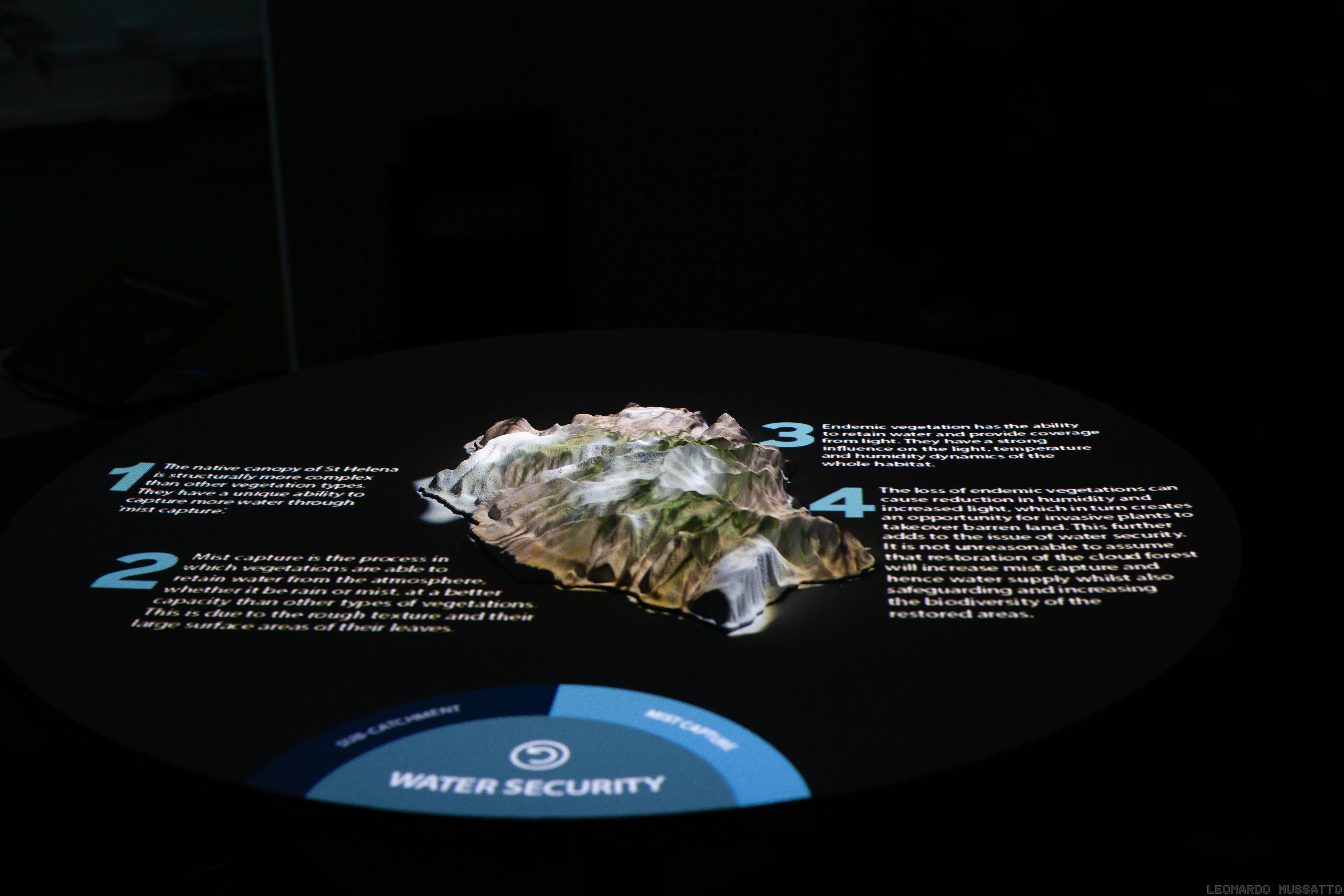 The Vanishing Cloud Forest is an installation showcase the research and restoration work of the Saint Helena Research Institute. Conceived as our major project for the Contemporary Media Practice degree at the University of Westminster, the installation combines an interactive 3D tabletop map, projection mapping, and a binaural soundscape to give visitors an embodied, layered view of the cloud forest ecosystem on Diana’s Peak.
